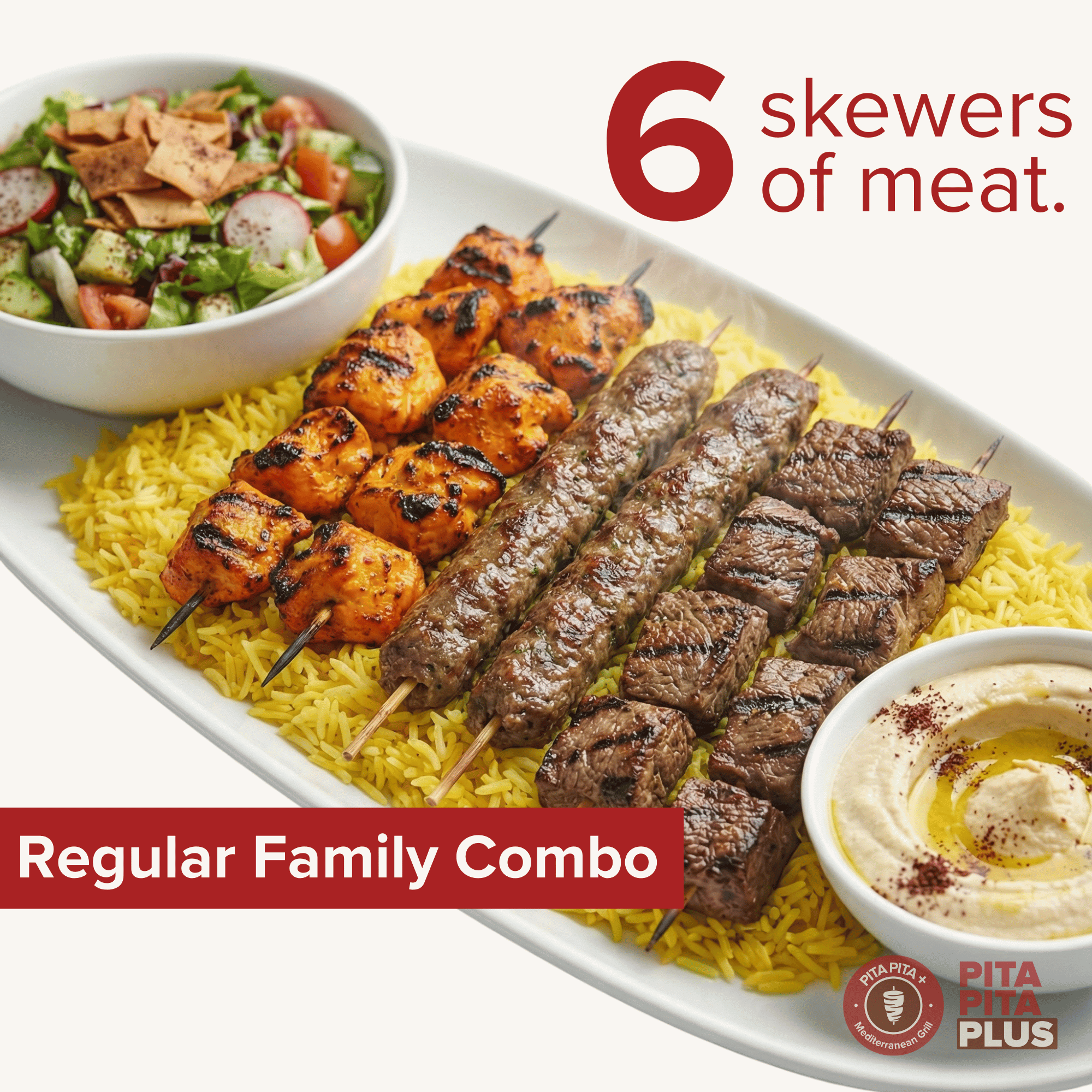 Regular Meal: Includes 6 kabobs of your choice, large rice, medium salad, and small hummus for $52.99. Large Meal: Features 12 kabobs of your choice, large rice, large salad, and medium hummus for $88.50. Perfect for sharing or enjoying a hearty meal with generous portions.