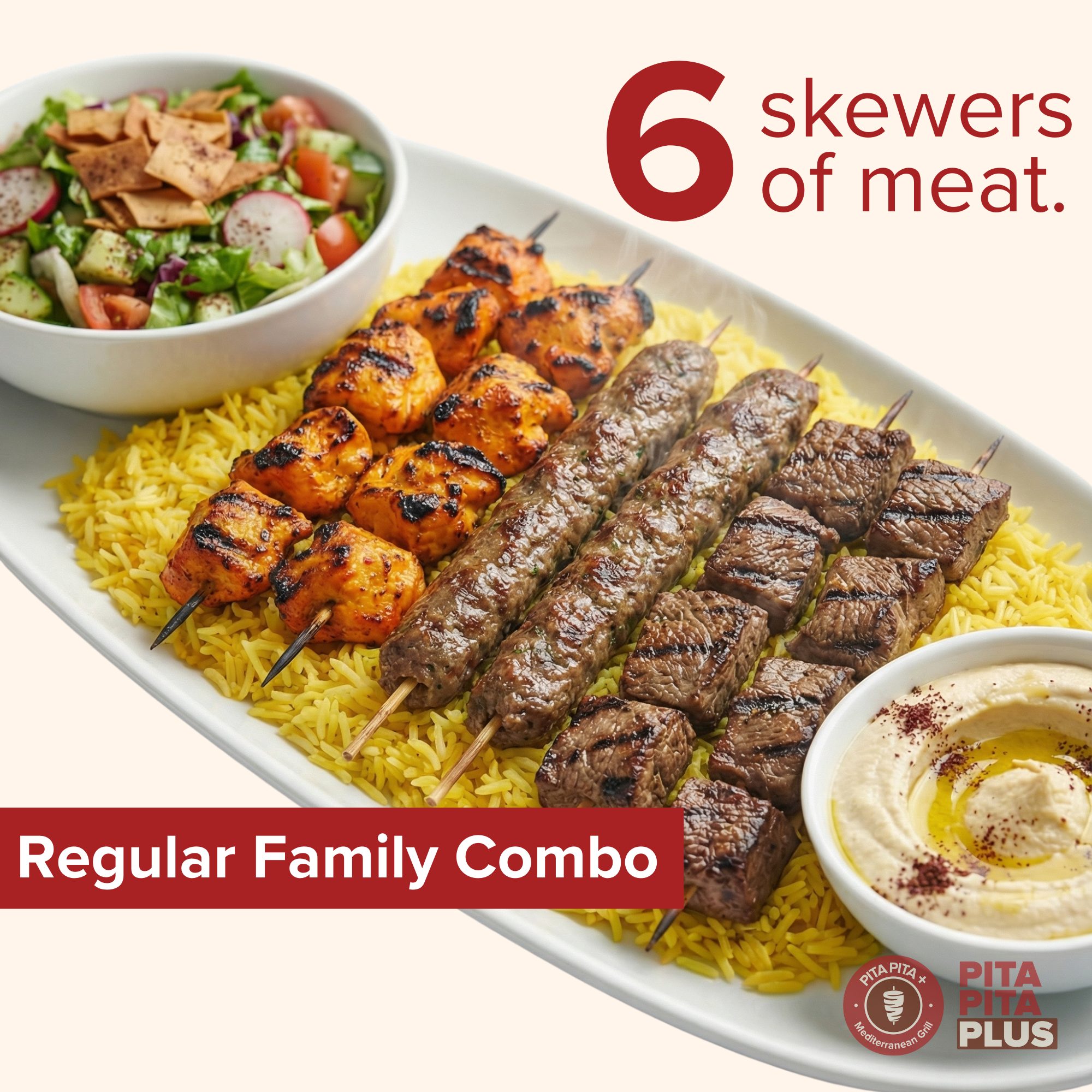 6 kabobs, large rice, medium salad, and creamy hummus. For when you’re hungry-hungry.